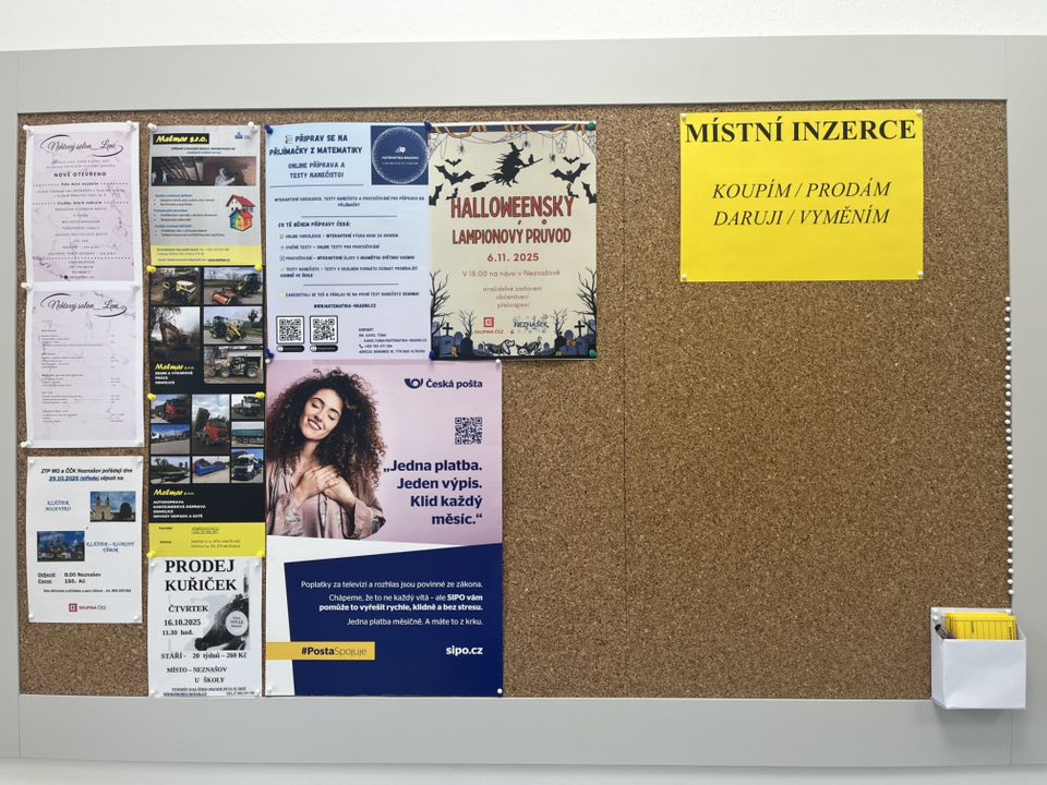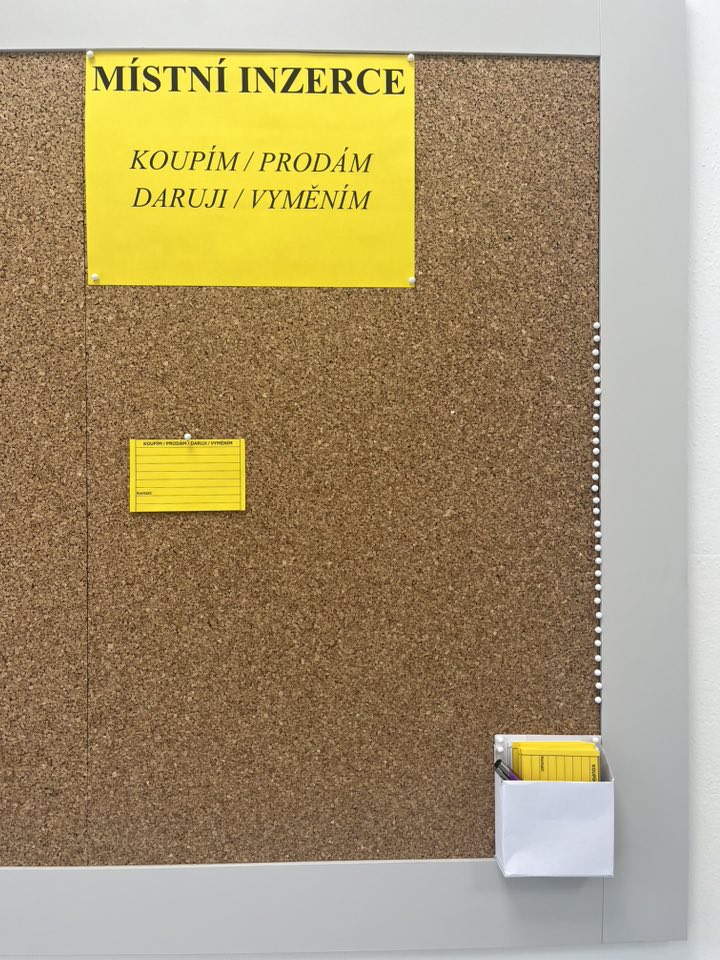 Nově můžete na poště a podatelně obecního úřadu u vstupu podat inzerát v místní inzerci. Část nástěnky nyní slouží Vám. V rohu nástěnky najdete lístky s názvem “KOUPÍM / PRODÁM / DARUJI / VYMĚNÍM”, které zde můžete vyplnit a vyvěsit.