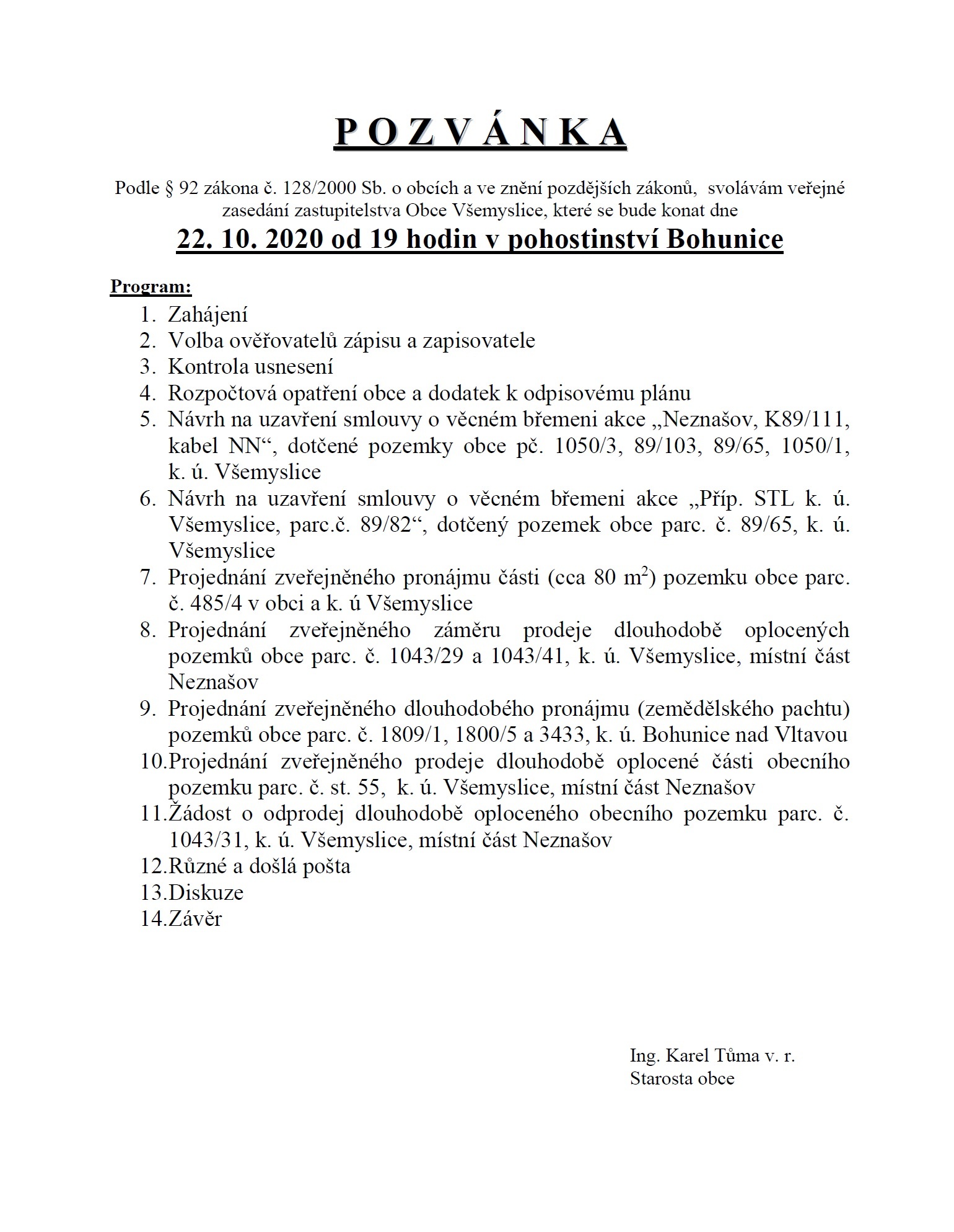 Zastupitelstvo obce Všemyslice se uskuteční ve čtvrtek 22. října 2020 od 19 hodin v pohostinství v Bohunicích.